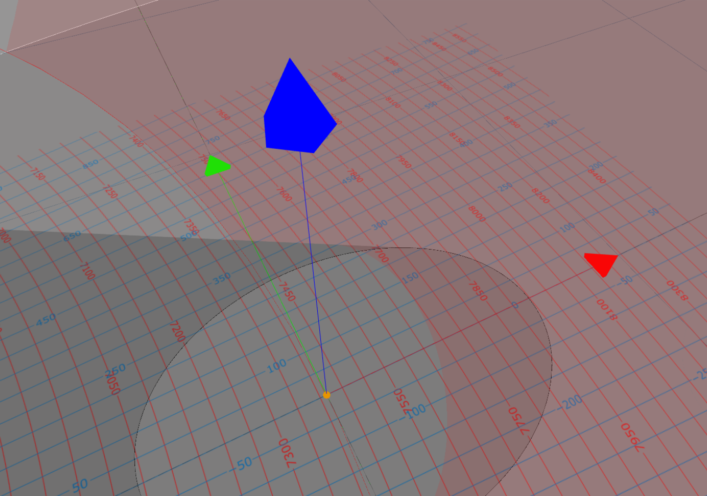 This referential frame centered on point of interest $P$ forms the main referential of the bistatic SAR configurator geometry. Each geometric parameter is thus expressed relative to this referential frame following the same color code and is illustrated on Figure 2 below. Realistic geometric configurations can thus be used by converting them into the local ENU plane relative to the point of interest. Each axis of the BSAR configurator referential frame have a length of 500 m and a grid helper is superimposed in light grey spaced of 500 m in both east and north directions. The extent of the depicted referential plane is of 30 km in each direction.Figure 2 - Illustration of the main referential frame of the Bistatic SAR configurator geometry. Each axis is 500 m long, the light grey grid helper has a spacing of 500 m in both directions and the extent of the referential plane is 30 km in both directions.